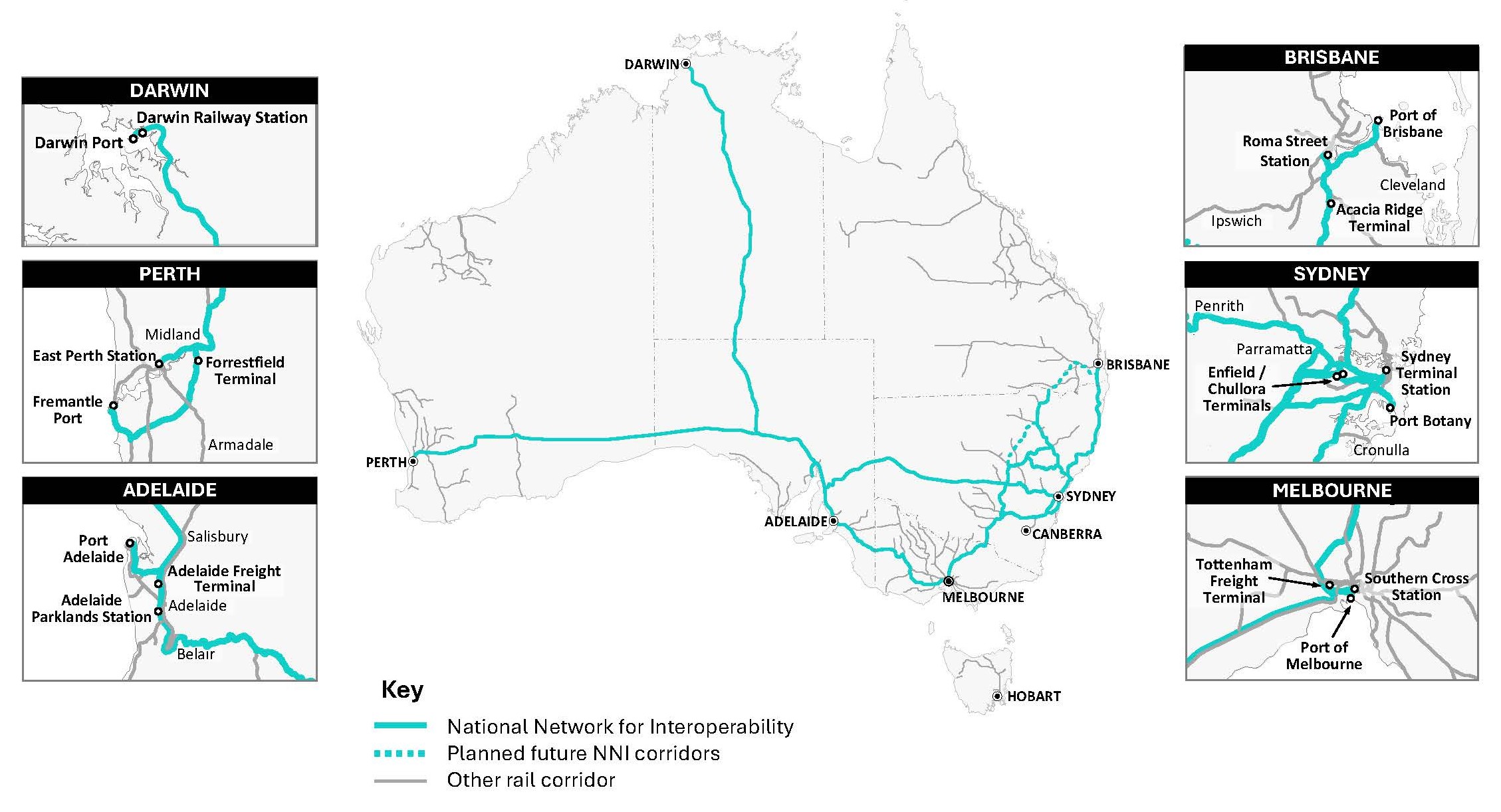 The NNI identifies the interstate freight and passenger lines between Australia’s major ports, regions and passenger terminals.